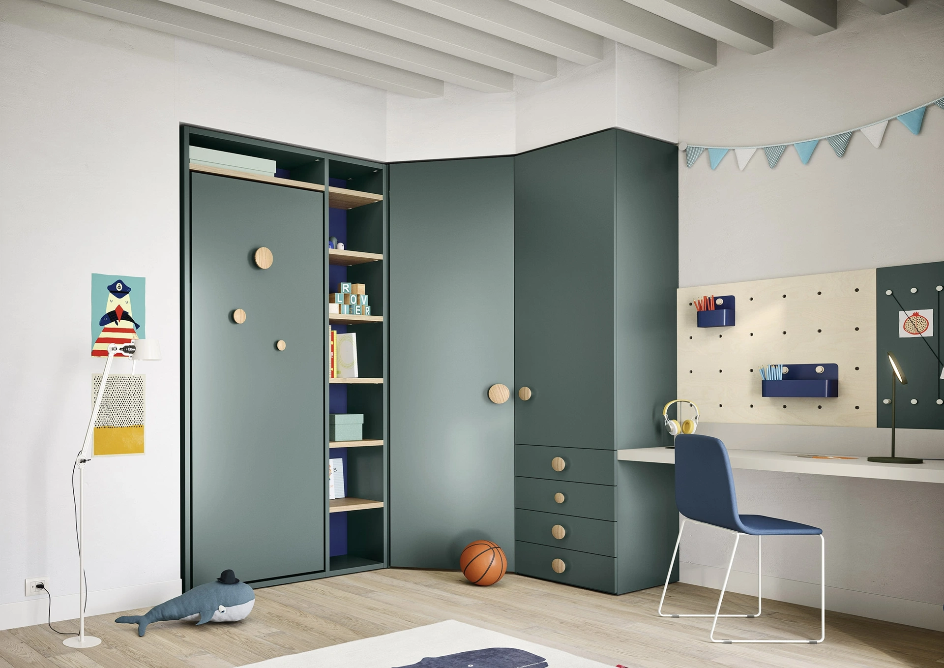 Porta contenuto estetico e cromie vivaci nella stanza dedicata ai più giovani con questa soluzione, una tra le Camerette salvaspazio per bambini di Nidi. Nidi propone un ricco catalogo di accessori da comporre su misura: troverai letto, guardaroba, tavolo da lavoro, sedie e librerie. Nell'arredamento della stanza dei giovani affidati a noi: nel nostro showroom presentiamo tutte le più esclusive composizioni arredative moderne per la loro camera. Questa soluzione in melaminico ultima ottimamente le doti di praticità e l'estetica della camaretta, poiché è capace di coniugare funzionalità ed ergonomia.