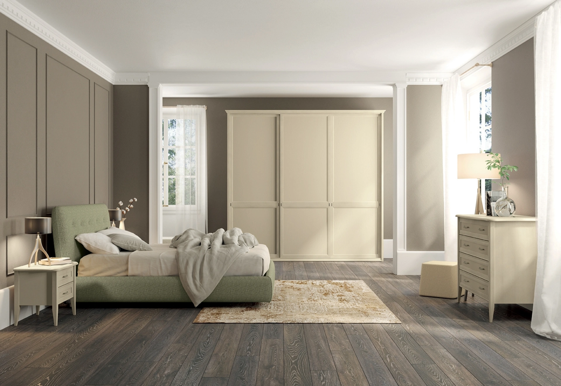 Il Gruppo Notte Arcadia Country Chic, firmato Colombini Casa, è un elemento distintivo della collezione Arcadia, progettato per infondere un'atmosfera classica e romantica nella camera da letto. Realizzato con cura in robusto melaminico, questo arredo, inclusi i pratici comodini, si distingue per le sue linee tradizionali e finiture cromatiche delicate, capaci di creare un ambiente sereno e accogliente. L'attenzione ai dettagli costruttivi e la scelta dei materiali garantiscono durabilità e un'estetica raffinata, integrandosi armoniosamente in diversi contesti d'arredo. La selezione accurata dei materiali e le opzioni di finitura disponibili riflettono un impegno costante verso l'eccellenza costruttiva e l'adattabilità stilistica.