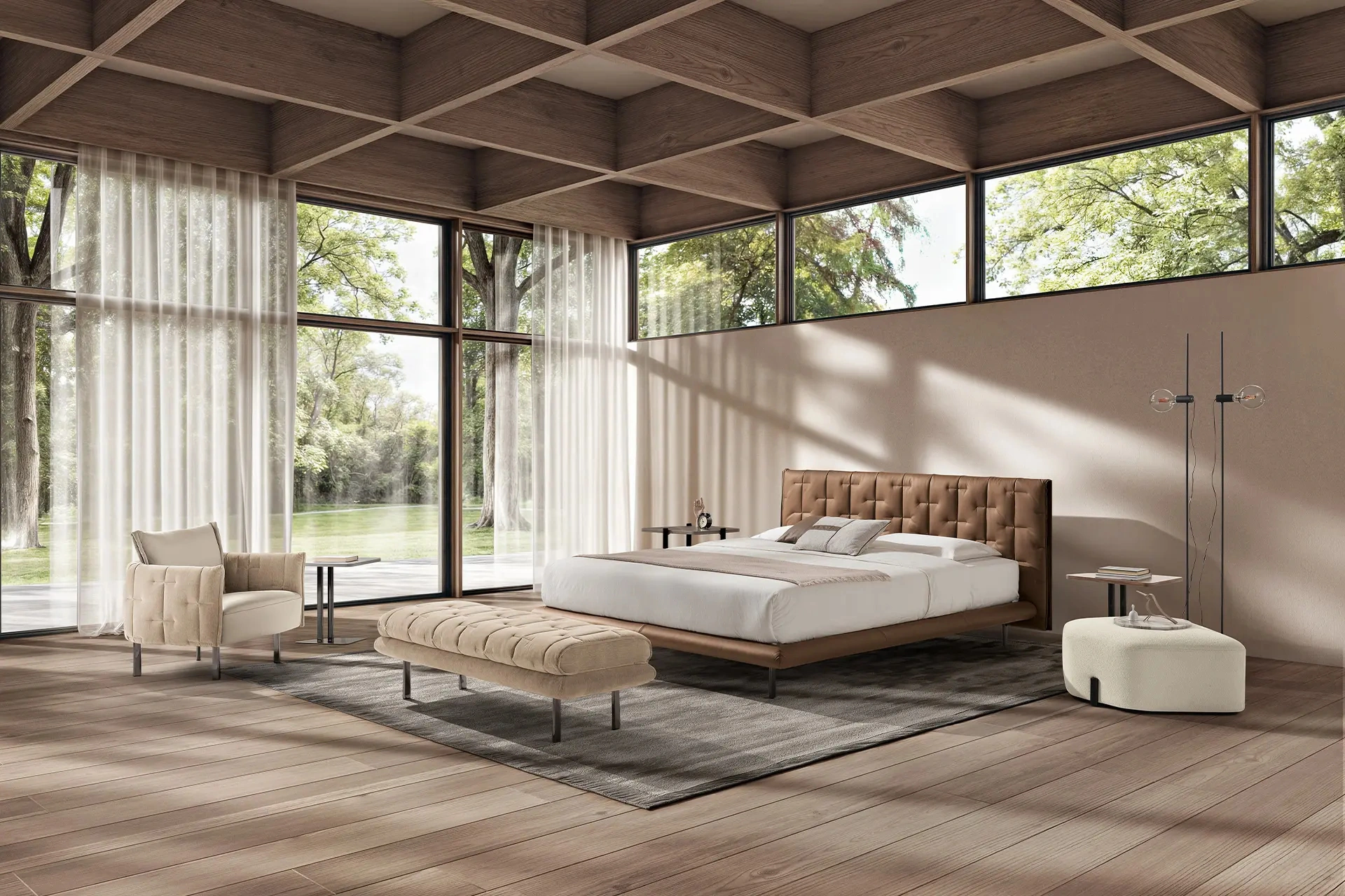 Il letto matrimoniale Muzzle di Max Divani si distingue per una struttura portante in legno massello, abbinata a una testiera caratterizzata da inserti metallici e una lavorazione sartoriale trapuntata in pelle. Questo modello integra un sistema di imbottitura perimetrale che garantisce comfort e resistenza strutturale. La precisione costruttiva valorizza il contrasto materico tra le finiture metalliche e la morbidezza del rivestimento. Scegliere un prodotto di questo calibro significa assicurarsi un elevato standard di comfort unito a una garanzia di eccellenza costruttiva che perdura nel tempo.