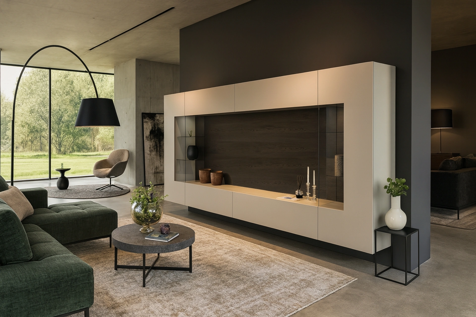 Questa composizione per soggiorno si distingue per le sue ante Lucifer, realizzate in vetro serigrafato cannettato, abbinate a una raffinata finitura laccato opaco sarmiento. Lo schienale in quercia carbone aggiunge un tocco di eleganza naturale. Un sistema di illuminazione a LED è sapientemente integrato sia nelle vetrine che nello schienale, creando un'atmosfera suggestiva e valorizzando gli elementi d'arredo. Il design è studiato per offrire funzionalità e un impatto visivo di alto livello. L'eccellenza dei materiali impiegati, dal vetro serigrafato alle finiture laccate e al legno, assicura durabilità e un'estetica inconfondibile, rendendo questo soggiorno una scelta di valore per ogni ambiente contemporaneo.