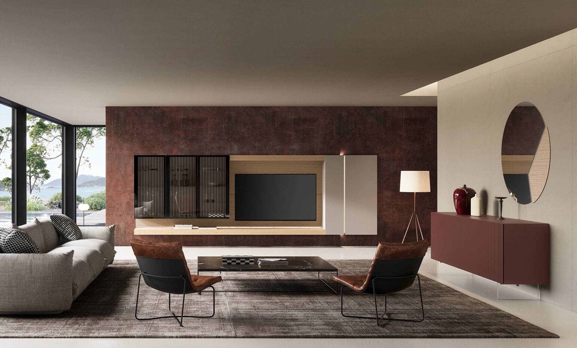 Questa moderna composizione da soggiorno, il Soggiorno Lucifer di Voltan, si distingue per la sua estetica raffinata e la funzionalità avanzata. La struttura è caratterizzata da una finitura laccato opaco beige ardenne, mentre le ante, nel distintivo modello Lucifer, si integrano armoniosamente. Elemento centrale è lo schienale porta TV, affiancato da mensole, entrambi realizzati in pregiata quercia, materiale che conferisce robustezza e calore. L'integrazione di una barra a LED inferiore garantisce un'illuminazione d'ambiente sofisticata, contribuendo a definire un'atmosfera accogliente e contemporanea. Il design è studiato per offrire soluzioni d'arredo durevoli e di elevata qualità costruttiva.