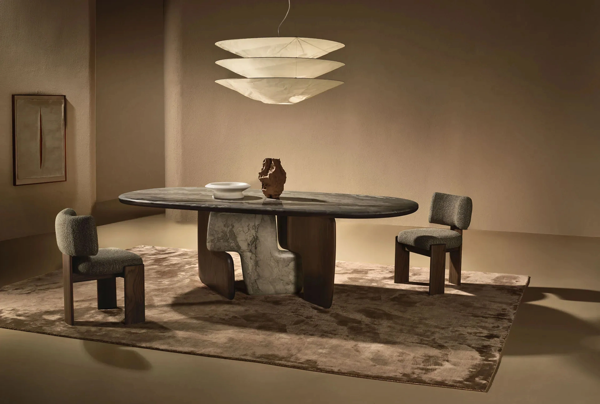Il tavolo Balance, opera del rinomato designer Gino Carollo, si distingue per un'estetica che celebra linee morbide e una struttura scultorea. La sua base è una composizione ingegnosa di moduli sinuosi e simmetrici che si intersecano con precisione, generando un dinamico gioco di luci e ombre, trasformando il supporto in un elemento visivamente coinvolgente. La versatilità è un pilastro di questo design, offrendo una vasta gamma di finiture e materiali selezionati: dalle essenze lignee pregiate come Secolare, Frassino e Noce americano, alle innovative laccature Luxor, fino alle finiture materiche e a una ricca varietà di marmi esclusivi quali Calacatta Gold, Patagonia e Arabescato Orobico. Questa scelta permette un'integrazione armonica in ogni contesto dining contemporaneo, garantendo durabilità e un'estetica raffinata.
