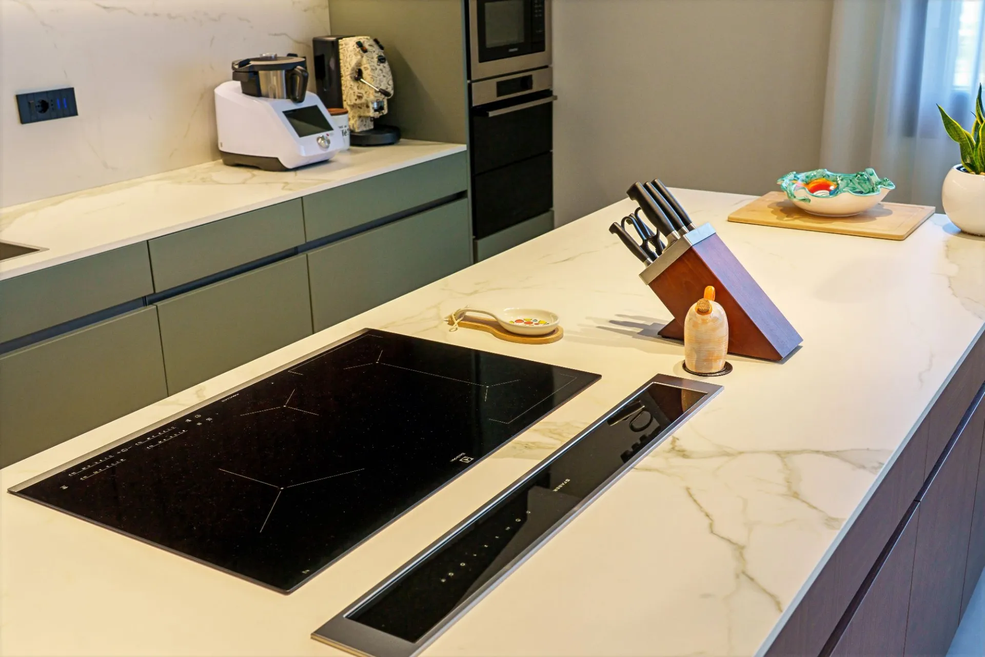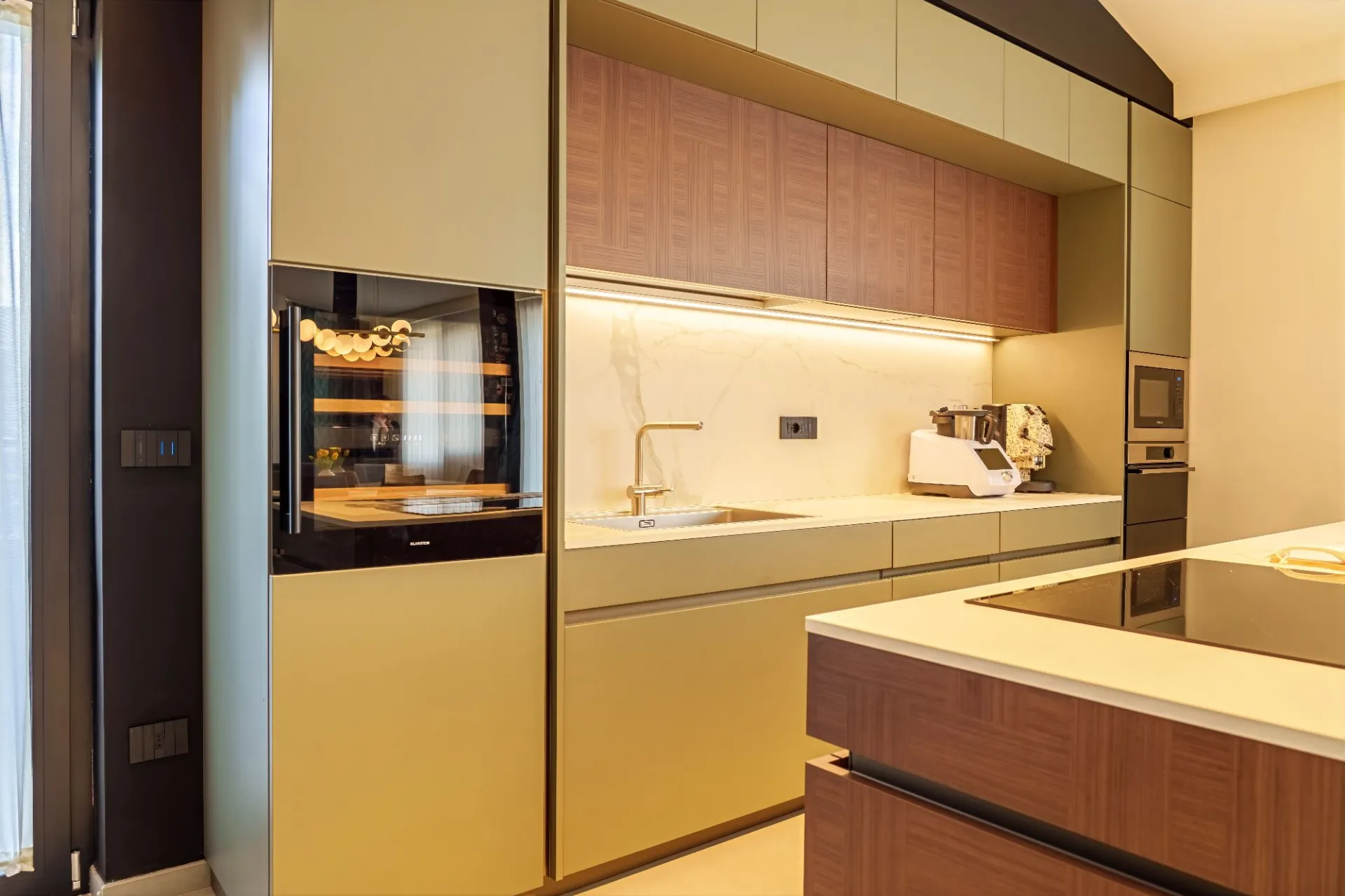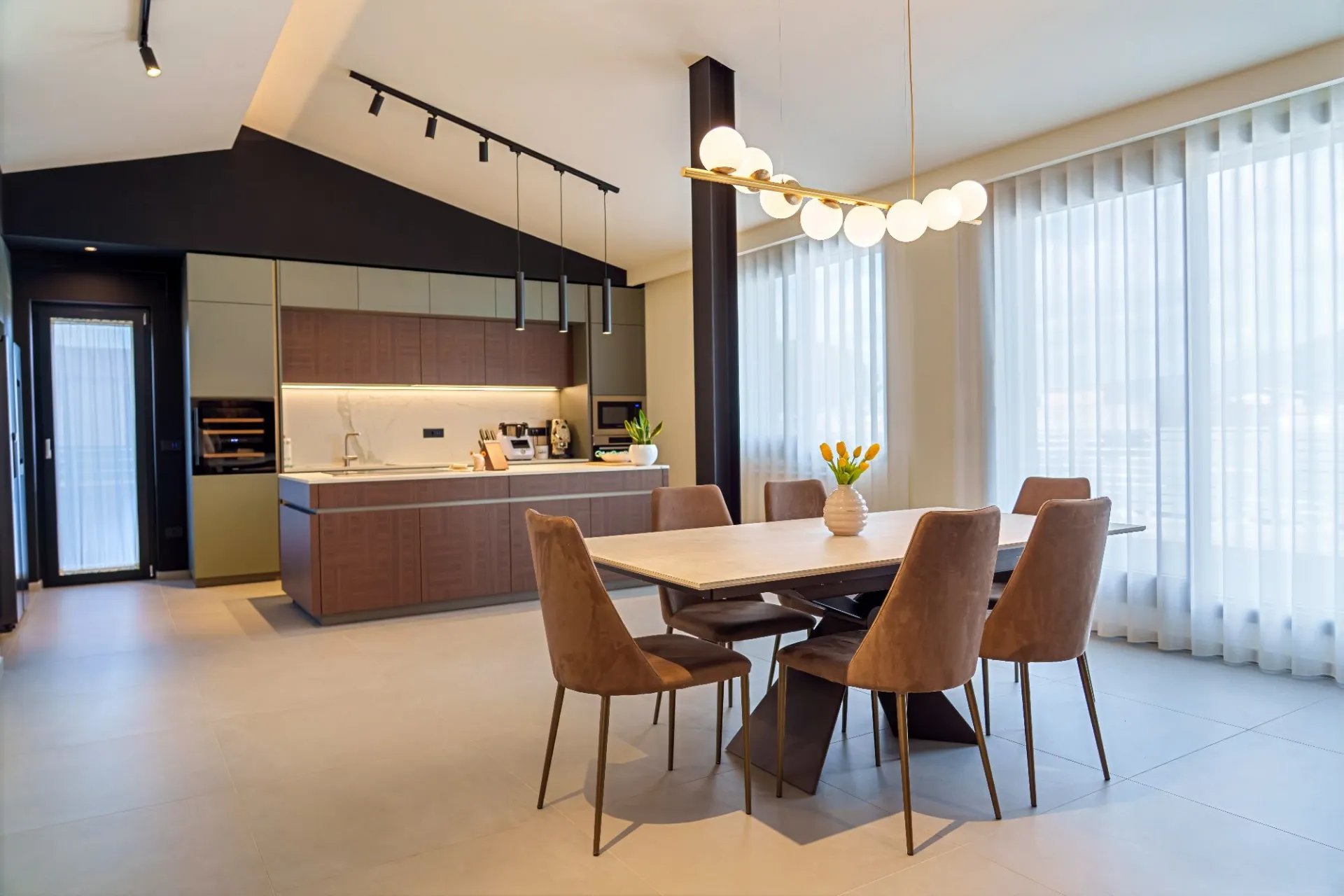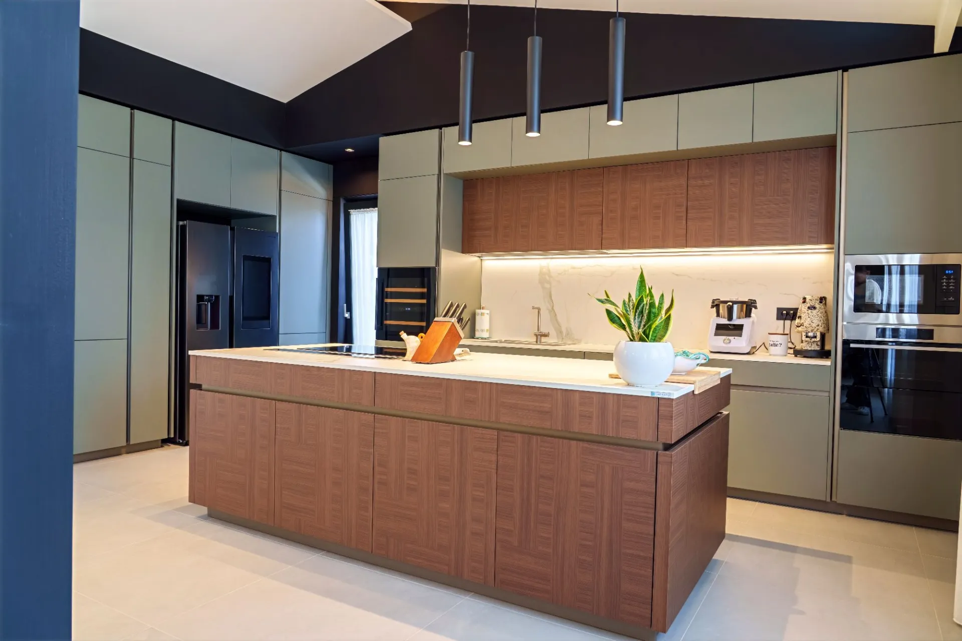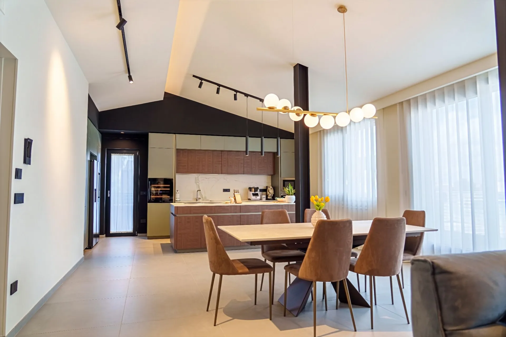 La cucina si sviluppa attorno a un’isola centrale, con superfici materiche effetto legno abbinate a finiture opache. Gli elettrodomestici sono perfettamente integrati e l’illuminazione tecnica a sospensione e su binario enfatizza la geometria dello spazio.