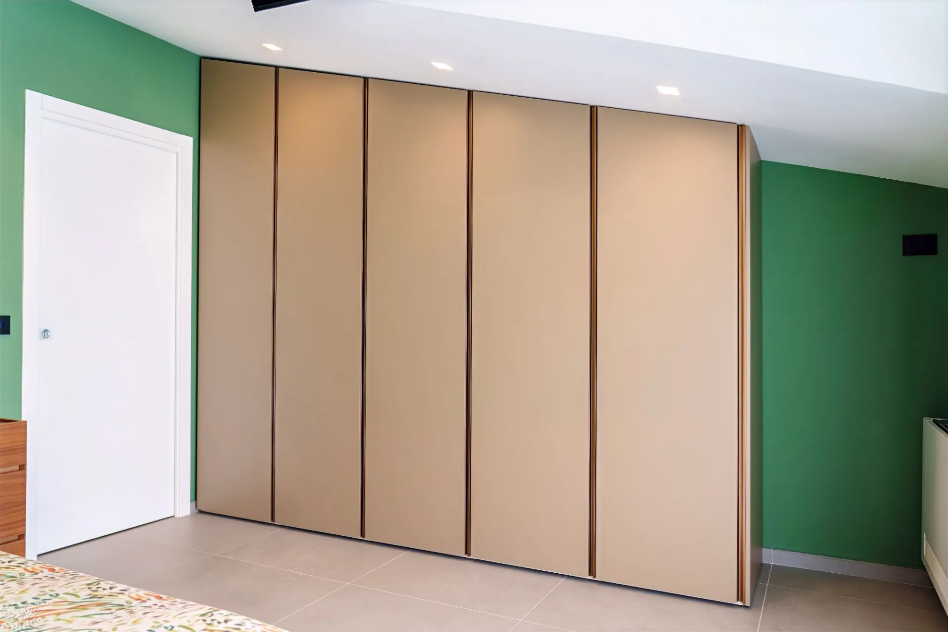 La zona notte è caratterizzata da un’armadiatura a tutta altezza dal design minimale, con superfici lisce e dettagli verticali che conferiscono ritmo e continuità visiva all’ambiente.