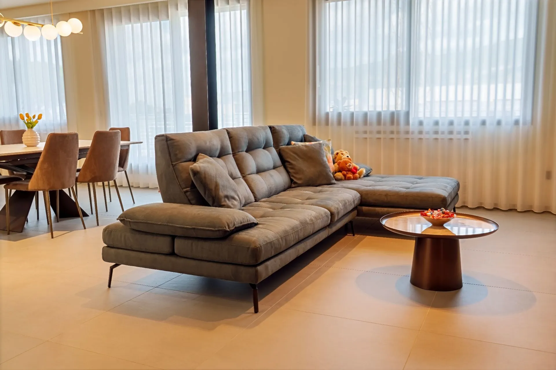 La zona living è definita da una parete attrezzata su misura che integra la TV, valorizzata da pannellature decorative e da un mobile basso dalle forme pulite. Il divano, dalle proporzioni generose, e il tavolino centrale completano l’ambiente con comfort e sobrietà, mentre la luce naturale filtrata da tende leggere contribuisce a un’atmosfera luminosa e accogliente.