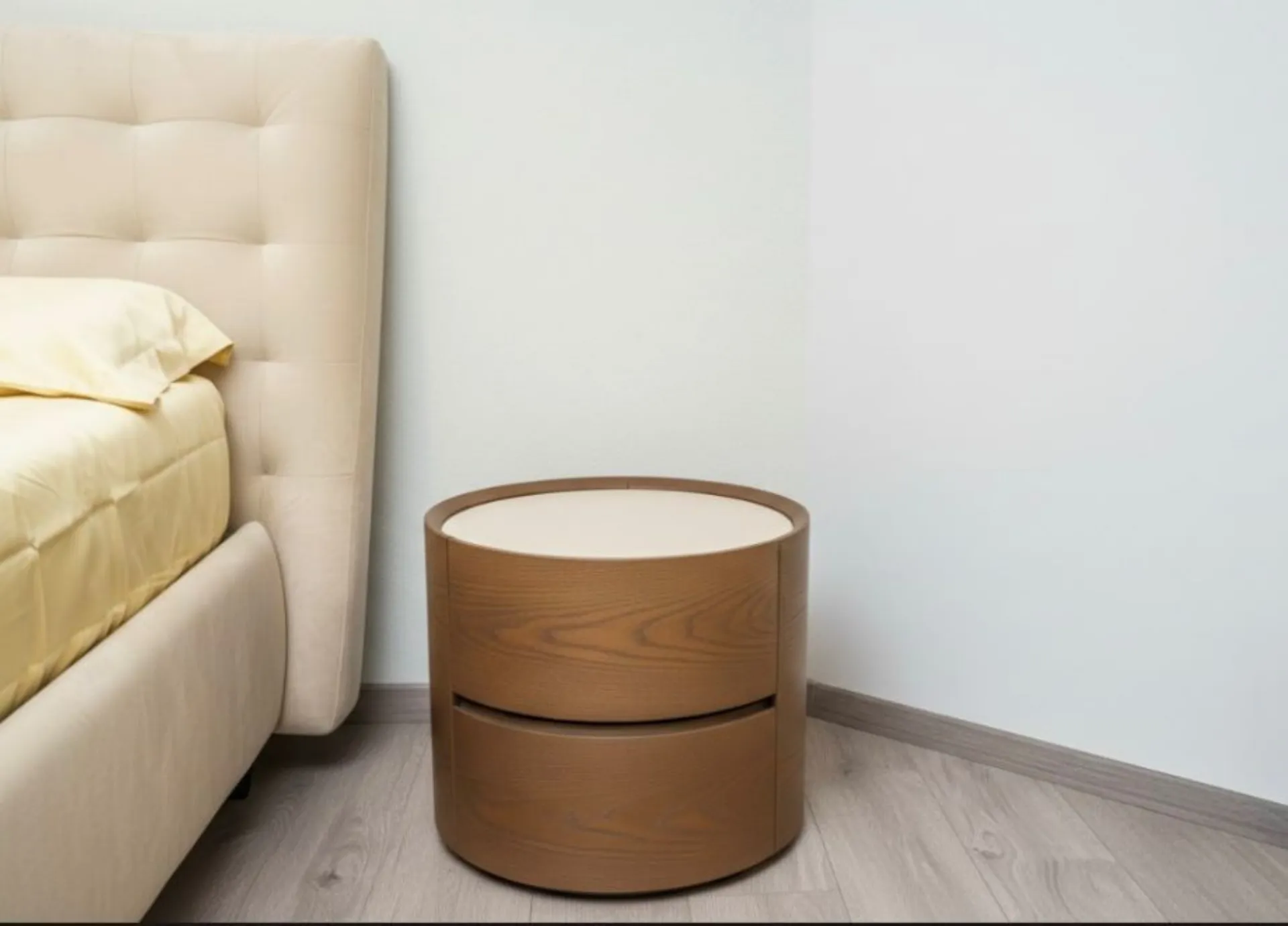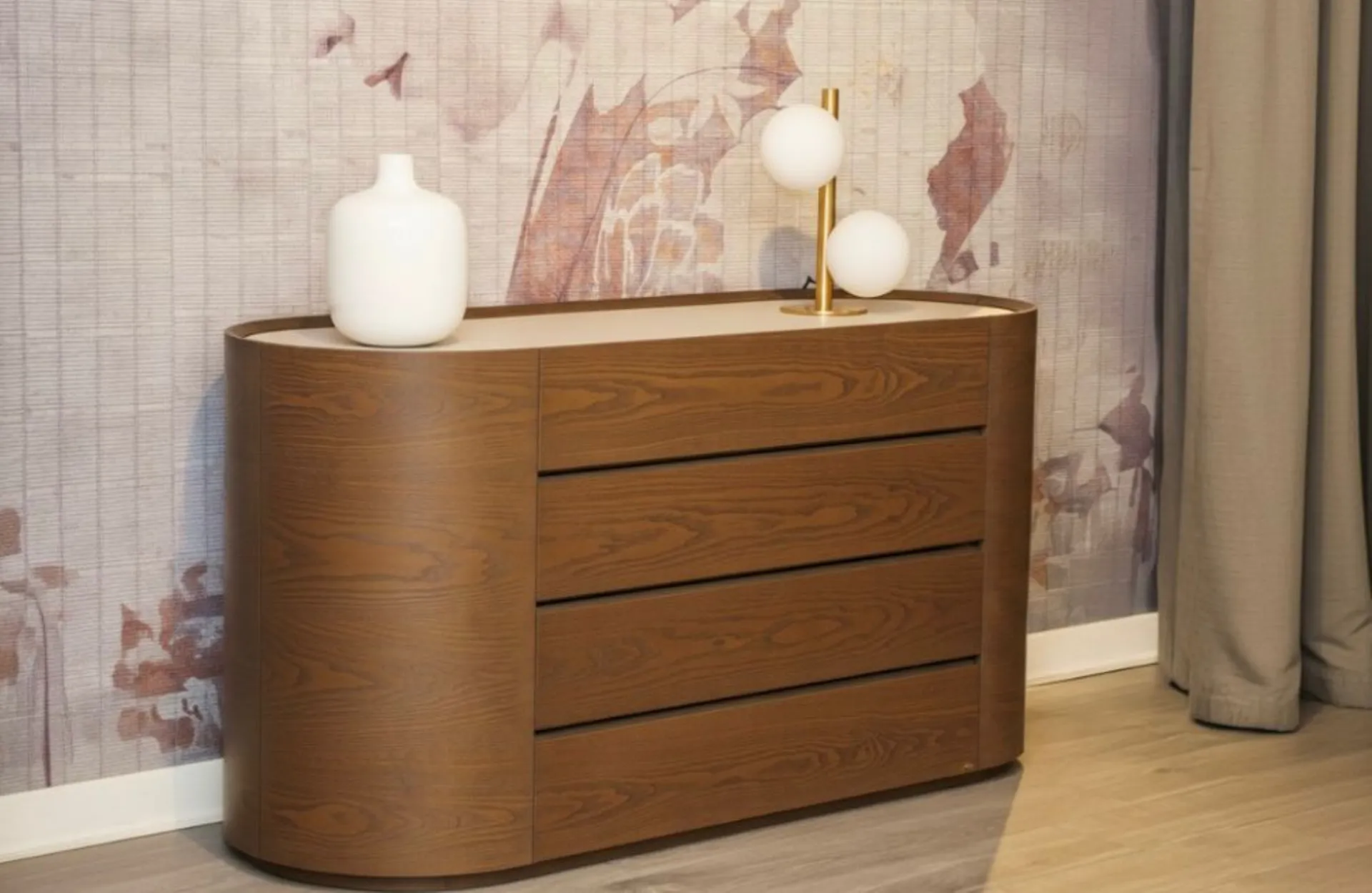 I comodini e la cassettiera, con la loro forma arrotondata e la lavorazione a poro aperto del legno, richiamano la natura e valorizzano il tocco artigianale della collezione. I profili curvi, privi di spigoli, donano morbidezza alla composizione e rendono l’ambiente particolarmente accogliente.