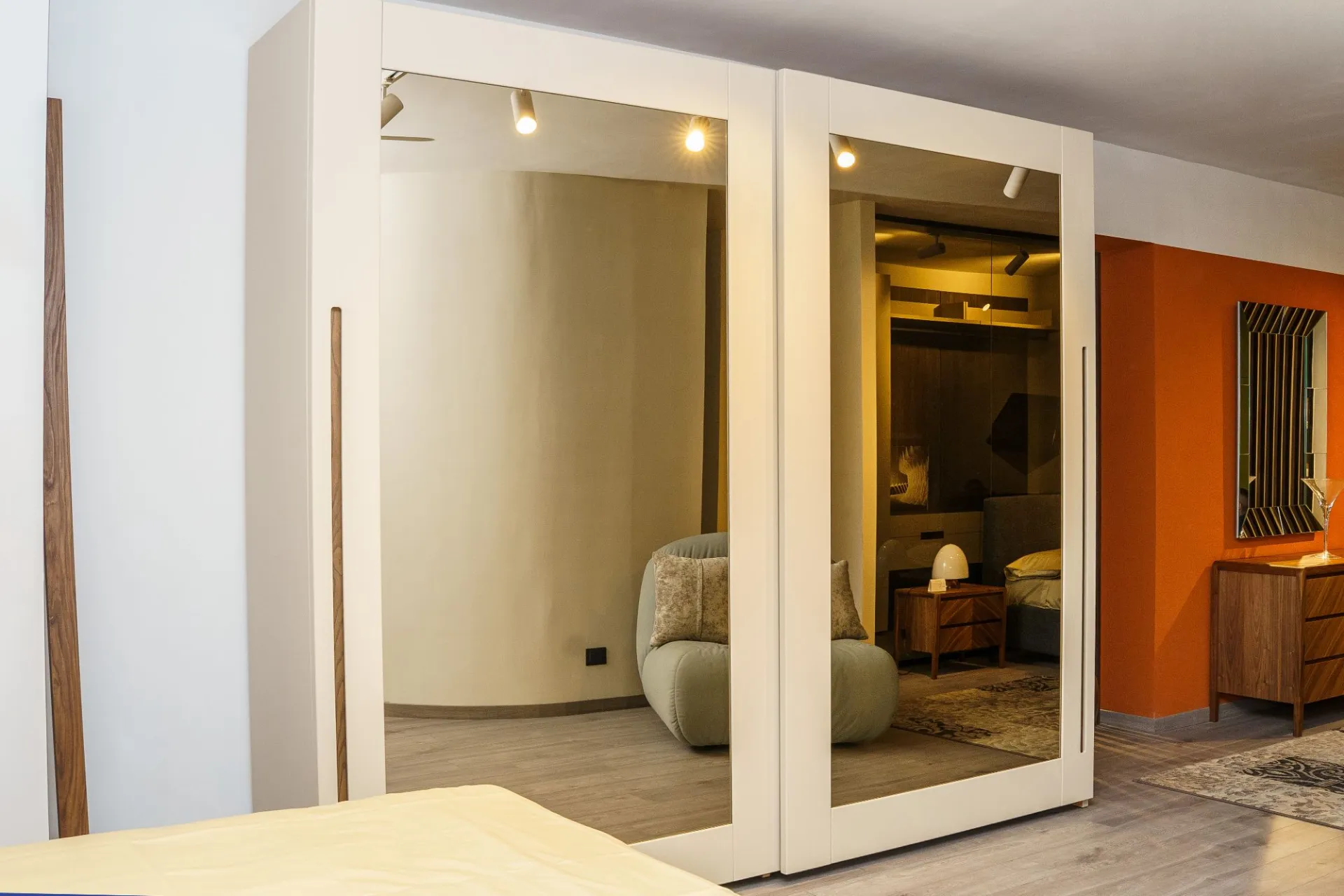 Completano la camera dettagli curati come piani in finitura raffinata, meccanismi di apertura soft-close e una gamma di finiture selezionate che esaltano la venatura del legno.