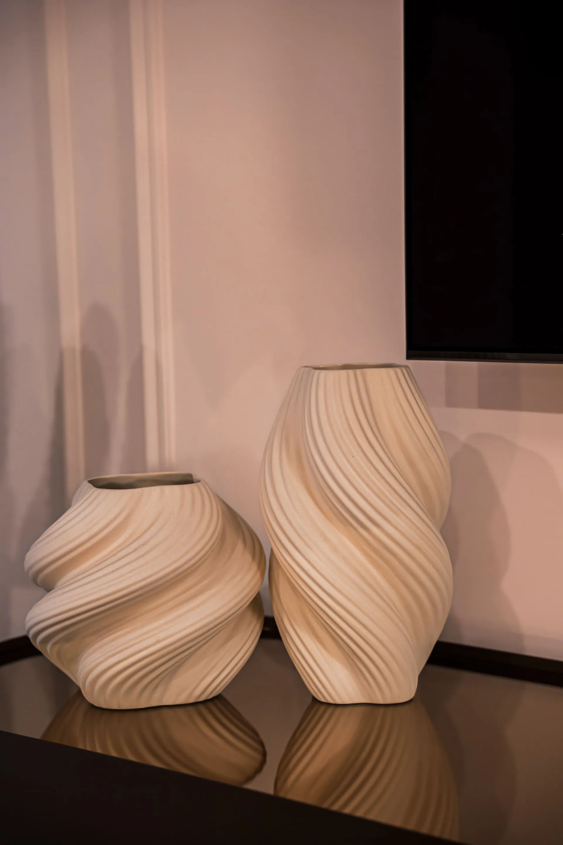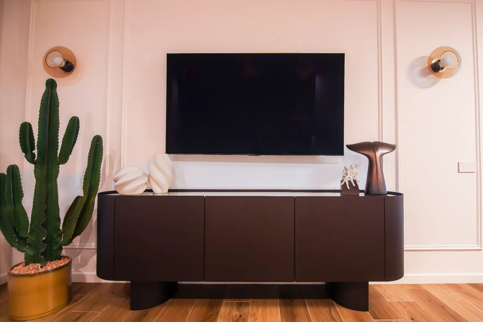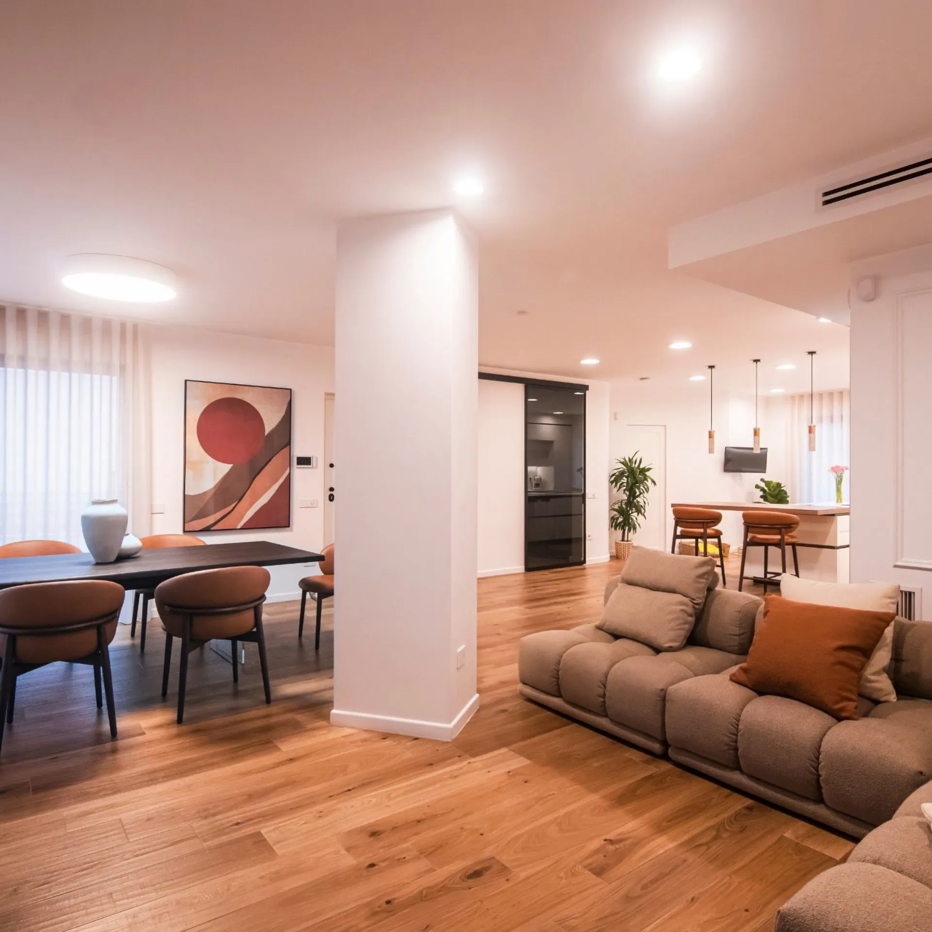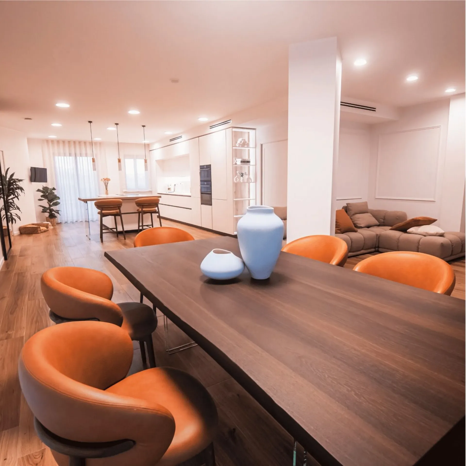 Nel living open space, il divano modulare dalle forme morbide dialoga con materiali naturali e dettagli decorativi, generando un ambiente accogliente ma contemporaneo.